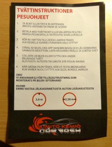 Jag körde in i tvätthallen tills det stod STOP på en röd lampa, stängde av motorn, drog åt handbromsen och låste dörrarna, allt enligt instruktionerna. Varför man behövde låsa dörrarna fattar jag inte, men det finns säkert nån förklaring till det.