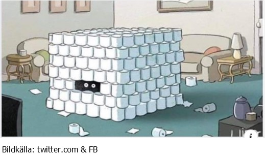 Så tillbaka till det där med toapapper. På FB florerar en bild lånad från Twitter där en individ har barri­ka­de­rat sig bakom murar av topapper för att undgå smitta. Husse läste nyss upp en orsak till att man hamstrar. Fritt översatt: En del låter bli att handhälsa på grund av Corona-viruset. Jag låter bli att handhälsa på grund av att alla är utan toapapper. 😀
