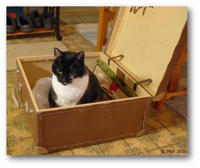 I dag hjälpte Husse mig att hämta ner adventsljusstakarna från vinden. Några av dom bor i en dragspelsväska. När den var nästan tom passade Mia på att provsitta den en stund medan hon tvättade sig. Dom bilderna blev dock suddiga eftersom hon rörde på sig, så jag bad henne posera i stället. 😉