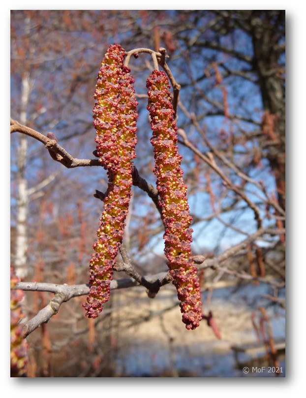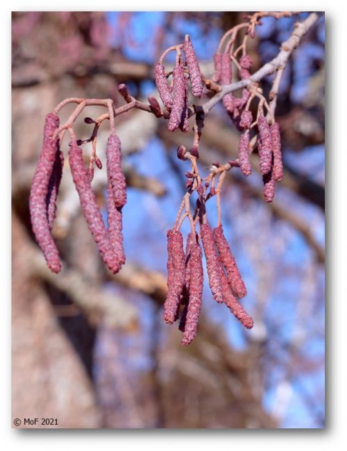 Jag har ett hat-kärleksförhållande till alar, men så här års tar kärleken över. Färgen på hängena antyder att den gamla alen i stranden förbereder sig för blomning. Om en dryg månad brukar det vara dags.