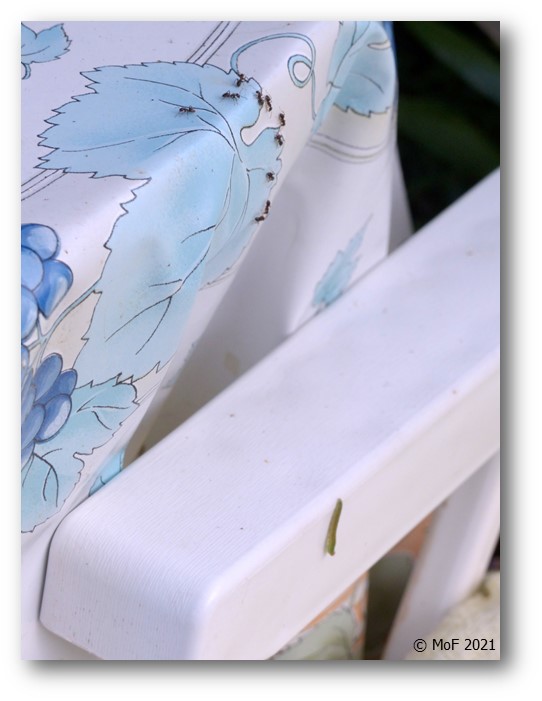 Vid ett tillfälle dök en liten grön mask/larv upp på bordet. ”Yeee, mera mat!” ropade några myror och gav sig på den, men den klarade sig genom att snabbt krypa undan och släppa ner sig från bordet till armstödet på solstolen som stod intill. Myrorna kliade sig i huv’et ett tag, men återvände sen till honungsfatet.