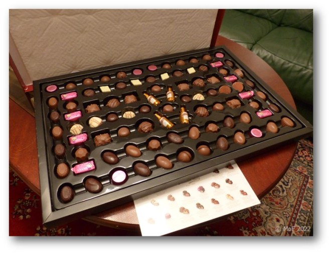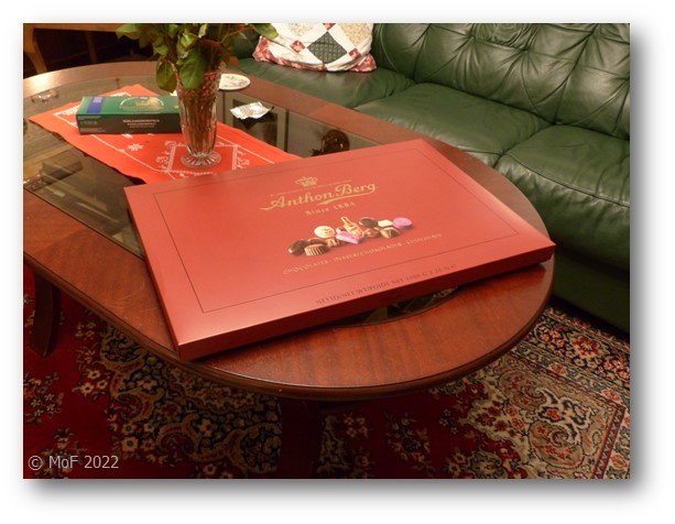 I julklapp fick jag ett helt kilo(!) Anthon Berg chokladkonfekt av Husses son. En så stor ask har jag aldrig sett tidigare! Asken får nätt och jämnt plats på bordet.