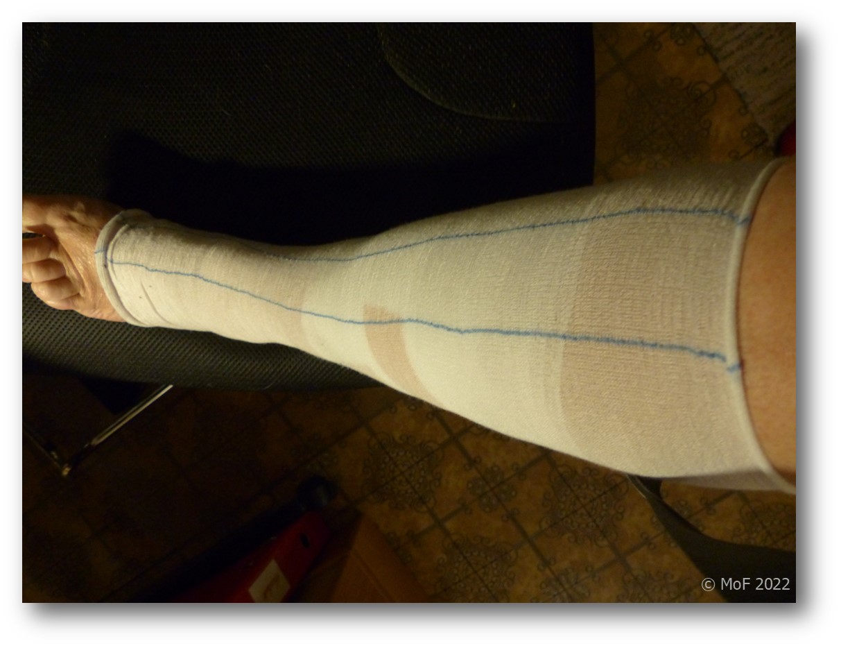 Anledningen till besöket var dock en stelkrampsvaccination och strumpan är bara till för att hålla bandaget på plats. Det ser värre ut än det är, men i går kväll kändes det minsann och blödde rejält.