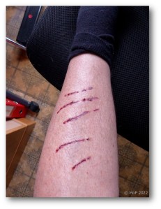 Mina rivsår har läkt fint och sårskorporna börja successivt lossna. Bandaget åkte av redan efter ett par dar för att såren skulle få luft. Jag inbillar mig att dom läker fortare då. Största avståndet mellan rivsåren är hela 4 cm, vilket säger en del om tasstorleken.