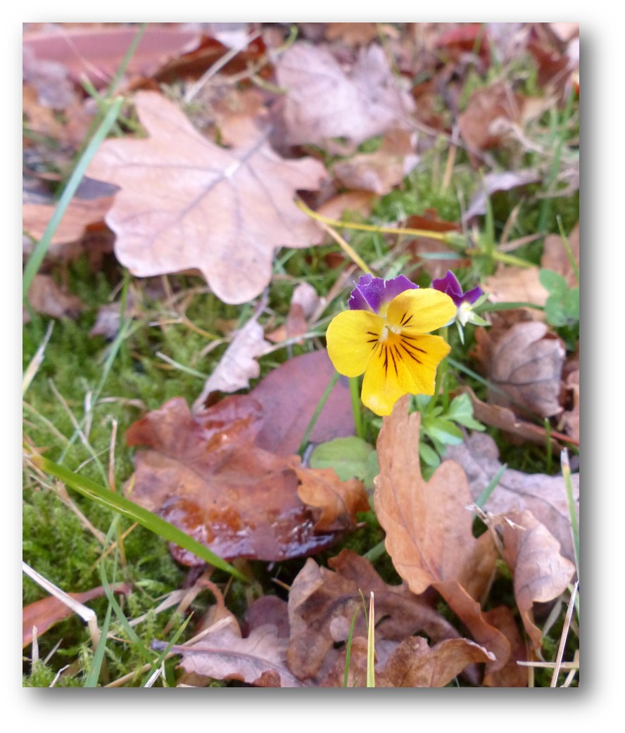 Bland löven framför trappan hittade jag en luggsliten liten viol som också blommar än.
