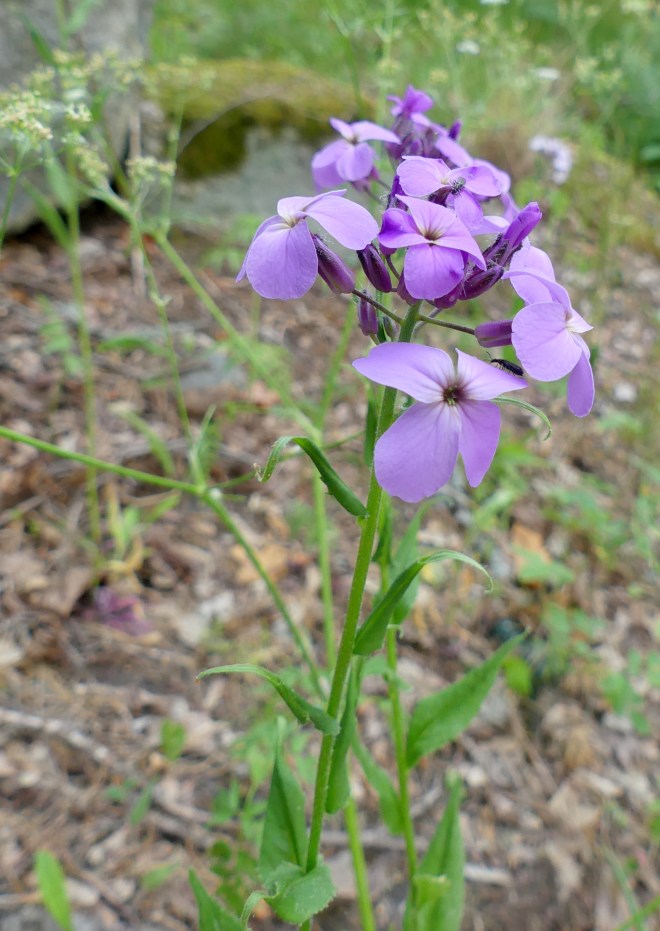 Den 25.6 fick jag syn på en nattviol som modigt kämpade mot torkan. Så öppet har jag aldrig tidigare sett nån växa. Dom brukar i regel hålla till på lummigare platser.