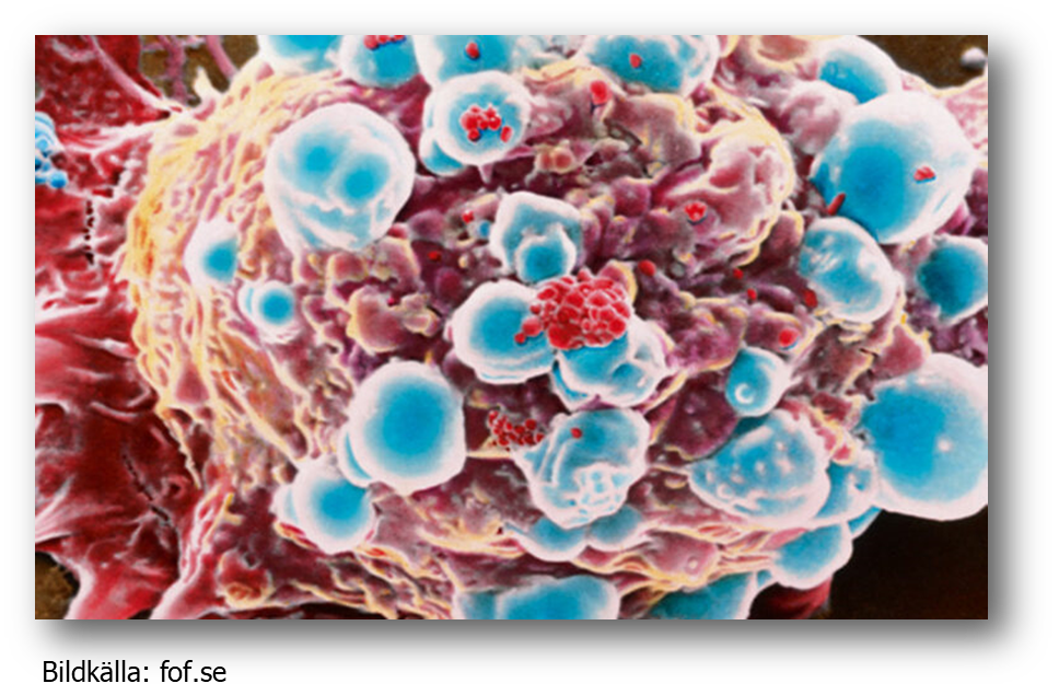 ”Cytostatika kan inte skilja tillräckligt bra på cancerceller och normala, snabbväxande celler. Cancerbehandling med cytostatika skadar därför också oftast en del av de normala cellerna i till exempel benmärg, hår och slemhinnor. Det kan medföra biverkningar såsom sänkta blodvärden, håravfall och mag-tarmbesvär.”