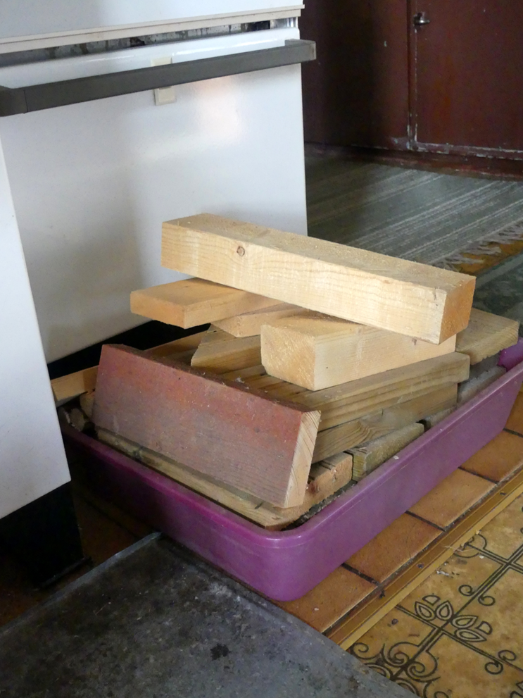 Sista uppgiften var att ta in ved. Egentligen hade jag tänkt fylla vedlådan, men ryggen var inte med på noterna efter allt kånkande så jag nöjde mig med att klyva tillräckligt för en korg. En hög med ”reserv­delar” fick också följa med.
