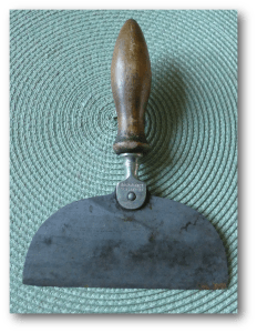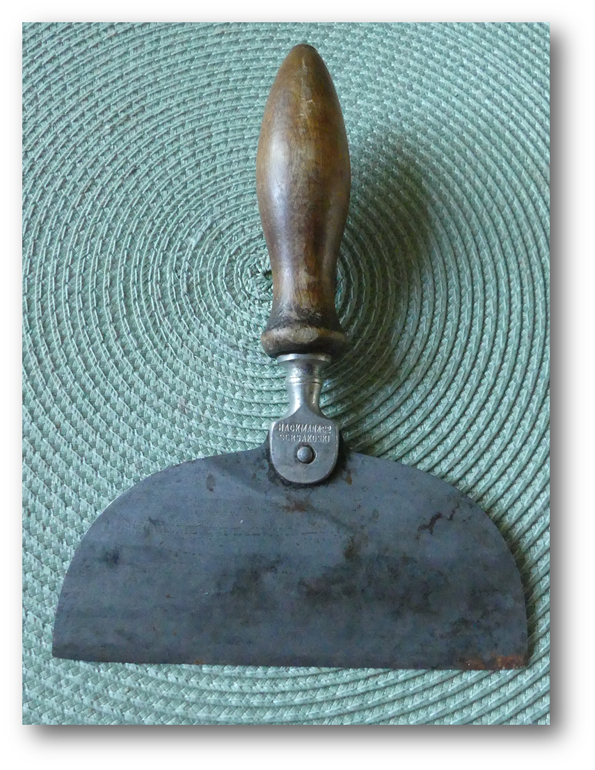 Längst bak fick jag syn på ett brunt träskaft som jag kände igen. Där var ju mitt hackjärn! Det som jag inte trodde att jag hade kvar. Dom av er som är bekanta med tillredning av sillsallad vet vad jag menar.