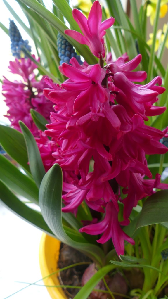 I krukan med vårblommor jag köpte före påsk fanns också ett par hyacinter. Den här färgen har jag dock aldrig sett tidigare – läckert röd. Heter Red Glory enligt Blomstervärlden.
