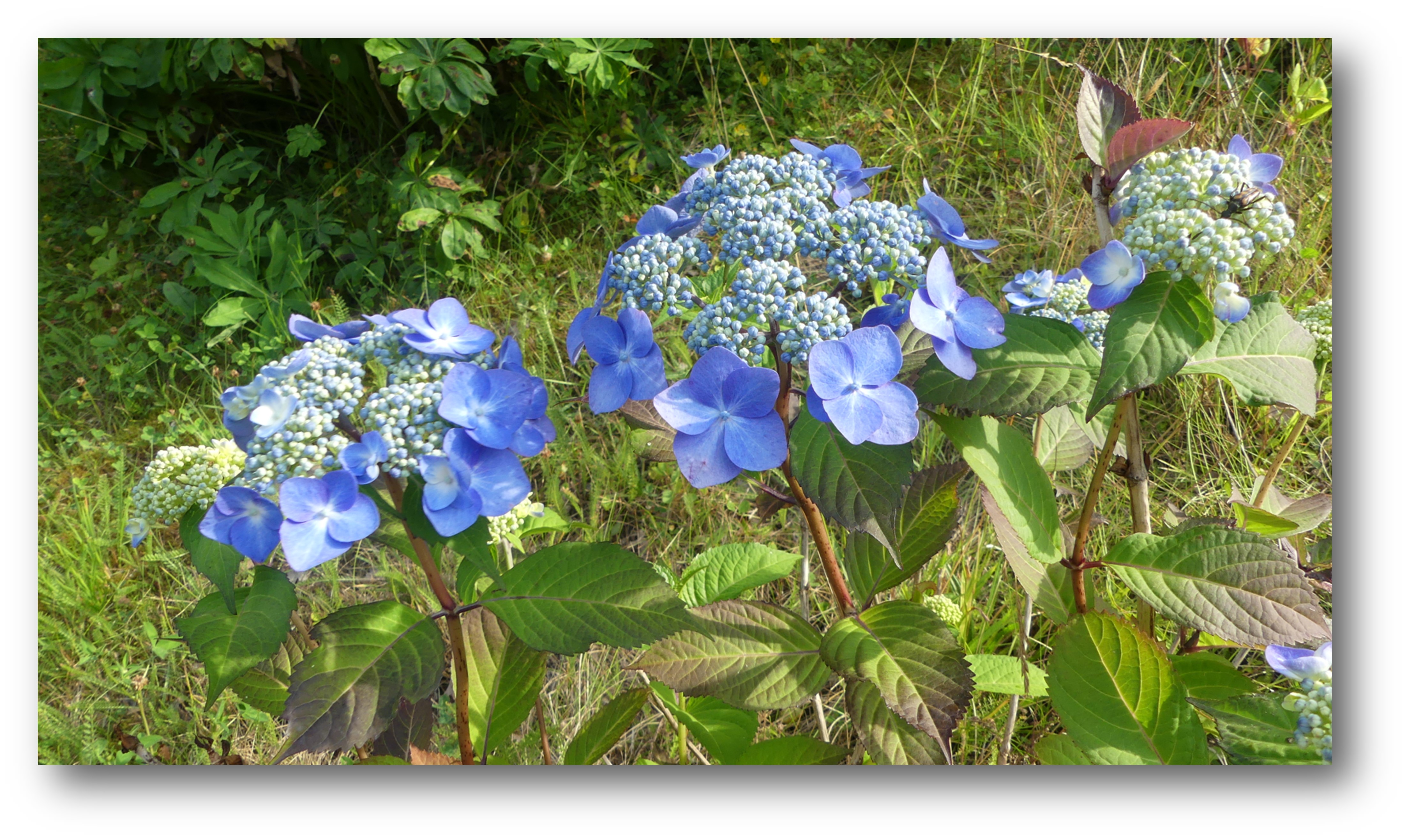 Fast nu är blommorna blå. Jorden har tydligen blivit surare med åren. Läste att man kunde återfå den rosa färgen med lämplig gödsling, men jag har inget emot den blå nyansen, så den får fortsätta så här.
