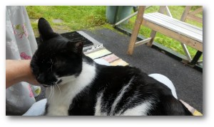 Efter det satte jag mig på trappan en stund och gosade med Mia i knäet. En liten fågel vågade sig flera gånger ner på marken eftersom vi satt stilla, men tydligen kände den sig iakttagen och tog sin tillflykt till rhododendronbusken mellan varven.