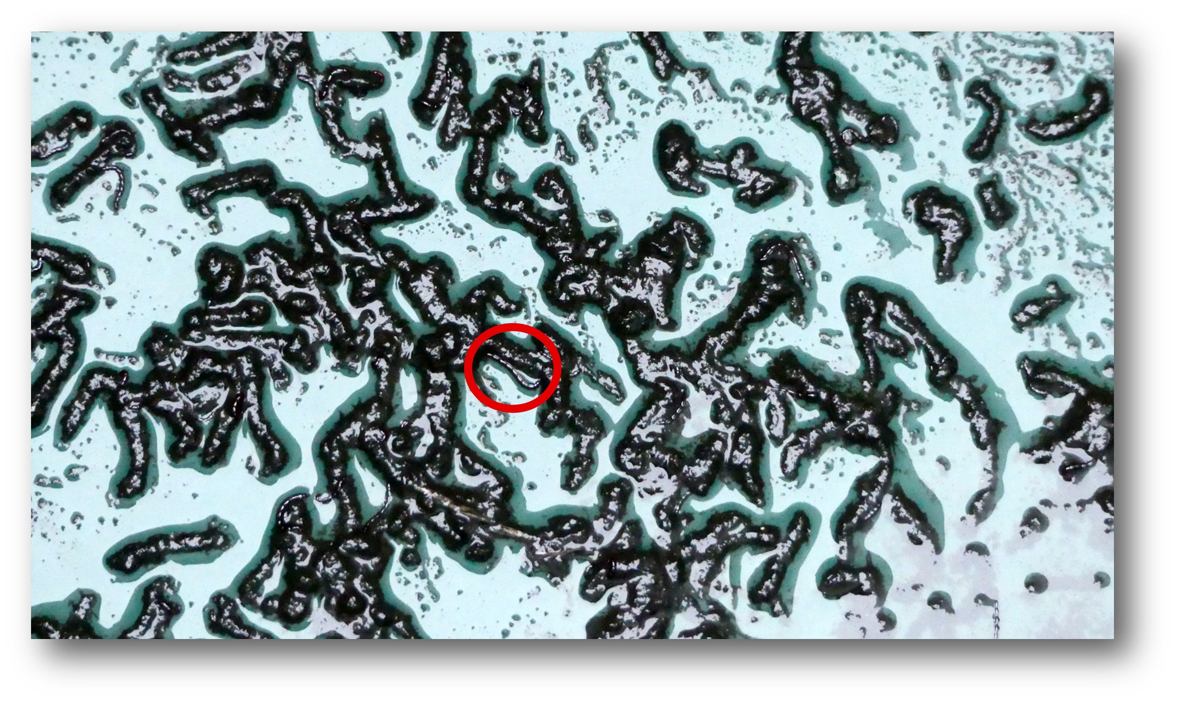 Däremot hade tunnans botten en intressant beläggning … Full med svarta små ”korvar”. Först trodde jag att det var larver av nåt slag, men efter en liten stund upptäckte jag små maskar som dök upp ur korvarna.