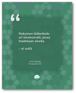 För ett tag sen hittade jag ett citat av en finsk läkare som slår huv’et på spiken. Fritt översatt från bilden: ”Modern läkarvetenskap är en affärsmodell där man behandlar symtom – inte orsaker.