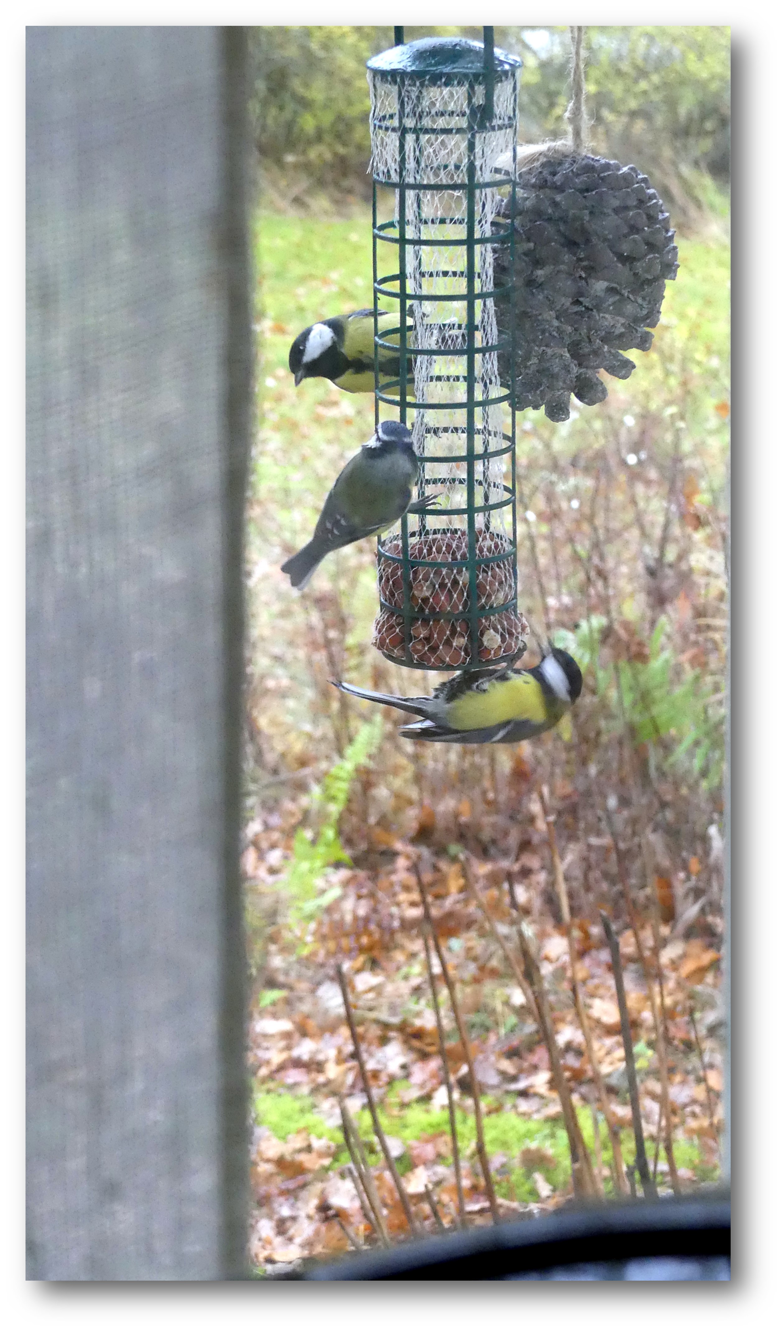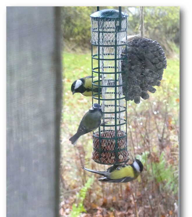 Så länge Mia levde avstod vi från att mata småfåglarna, men nu tyckte vi att det var läge. Husse fixade en stång som man kan hänga upp maten på utanför köksfönstret.
