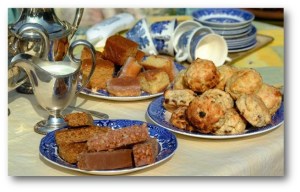 Ute på terrassen hos Husses moster och morbror stod kaffebordet dukat och väntade. Jag fick genast skuldkänslor. Hade jag vetat det, hade jag inte ätit våffla på vägen. Men jag fick ändå plats med en mugg kaffe och en bit toscakaka. En sån går alltid ner. 😉