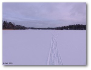 När jag hade nått ”Lingongrannens” brygga hade jag redan fått nog och beslöt vända hemåt. Jag hann bara åka en liten bit i mitt nya spår innan det blev tvärnit. Under snön låg en fläck med vatten på isen och nu hade vattnet blött upp skidspåret. Grrr.