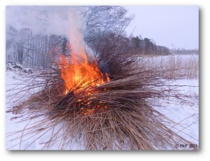 Dagen efter vassröjningen kapade Husse buskarna i strandkanten och sen tände vi på. Inte en pipa, men väl vass‑ och kvisthögen. Man kunde tro att torr vass är lättantändlig, men så är det inte. Först efter att ha fått några vedklabbar att brinna tog elden fart.