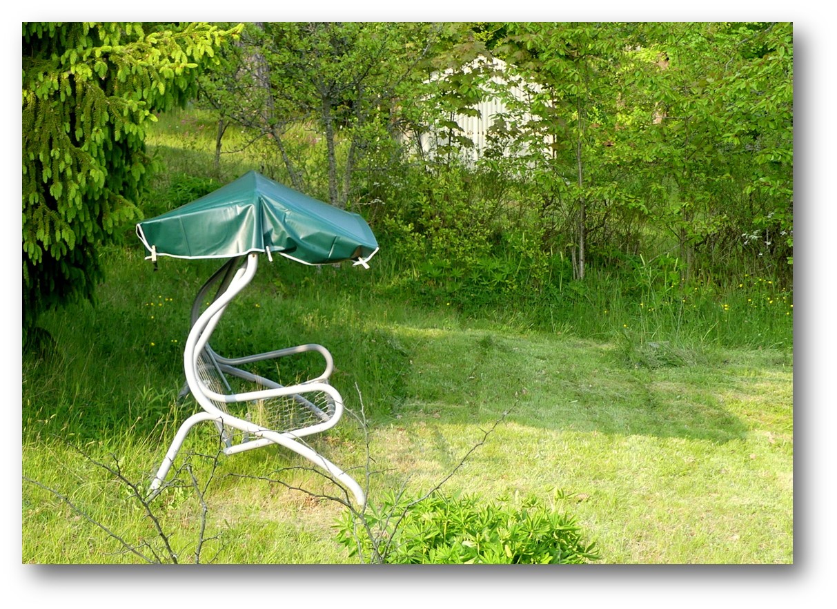I dag fick hammocken sitt nya tak monterat. Den här gången valde jag ett mörkgrönt. Det förra var beige och blev både smutsigt och trasigt med åren.