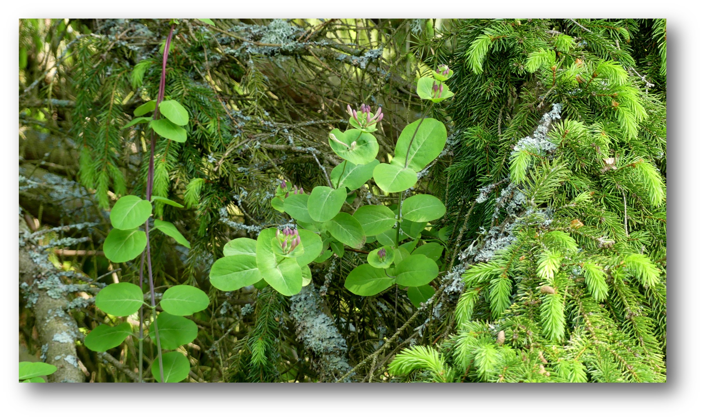 Jag ställde mig tveksam till svaret jag fick, men i dag insåg jag att kaprifol var rätt svar. Mellan grankvistarna syntes kaprifolknoppar. Hur den har tagit sig dit är ett mysterium? Men om den trivs där är det helt OK för min del. 😊