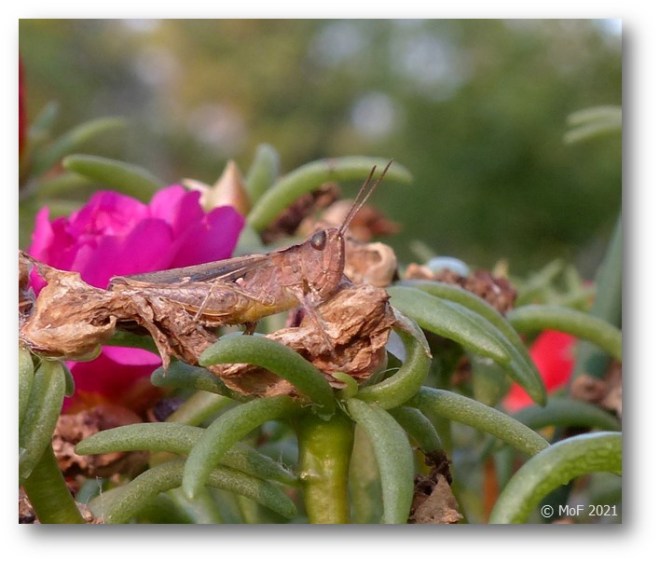 På kvällskvisten upptäckte jag en gräshoppa (eller en syrsa?) bland dom vissna blommorna i en ampelkruka. Ett utmärkt kamouflage. 🙂