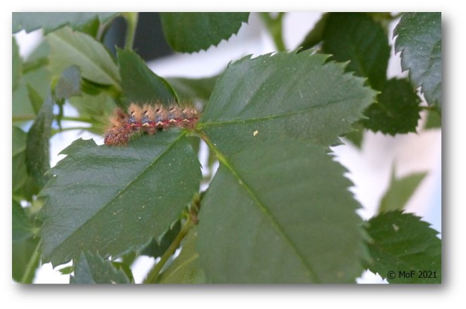 Den 23.7 skrev jag om en larv i min krukros. Fram till den 29.7 växte den, frodades och lät sig beundras, men efter det har den inte synts till längre. Har den tröttnat på rosblad, blivit en fjäril eller mat åt nån?