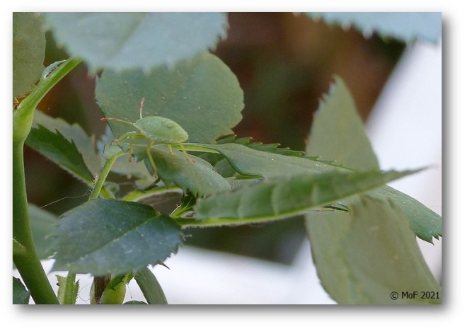 Min krukros hade besökare i dag. Dels den här skinnbaggen, men också en hårig pyttelitenlarv som smaskade på ett blad. Tyvärr misslyckades ”framkallningen” av den bilden.