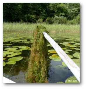 Fördelen med vattenväxterna är förstås att de renar vattnet, men nackdelen är att sjöbotten vimlar av växter, vilket gör det knepigt att ro och simma. Varje avbruten växtdel blir dessutom en ny planta så det gäller verkligen att ro försiktigt!