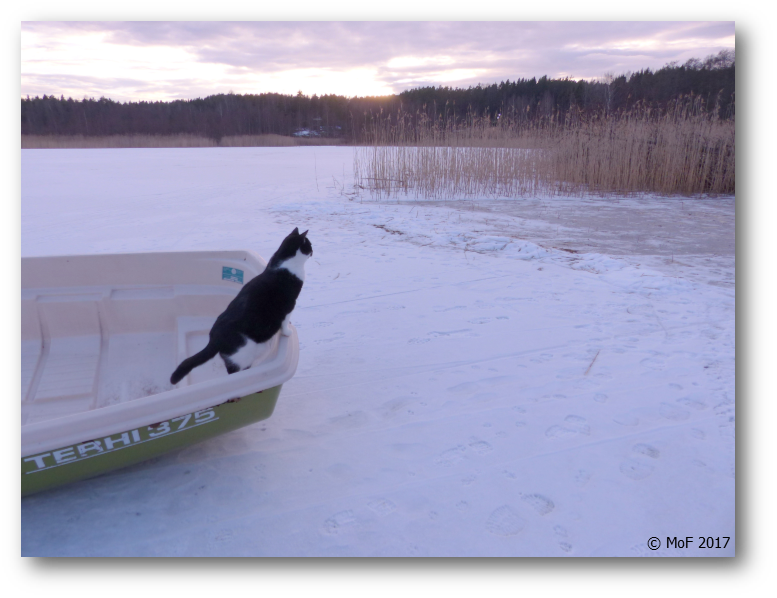För att föreviga strandröjningen gick jag och Mia ner till stranden vid solnedgången i torsdags. Eftersom träden riskerade falla över båtarna drogs dom ut på isen. Det tyckte Mia var en perfekt utkikspunkt för att studera den nya strandlinjen.