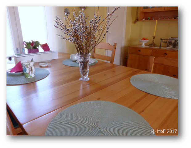 Fast dom nya bordstabletterna kommenterade hon inte eftersom hon ju inte kunde veta att dom var nya. Hon såg i stället buketten med videkissar som prydde bordet och tyckte att jag hade gjort påskfint.
