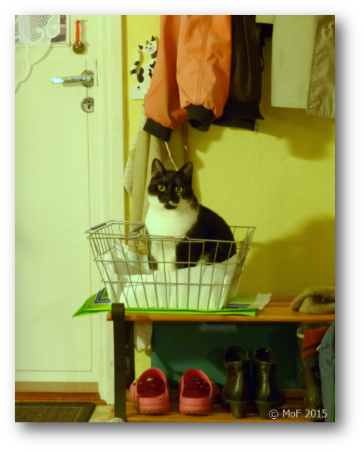 Ibland ställer jag mathämtningskorgen på skostället vid dörren tills jag har annat ärende ut i verandan. Det tycker Mia är en utmärkt väntplats tills jag öppnar dörren och släpper ut henne. 🙂
