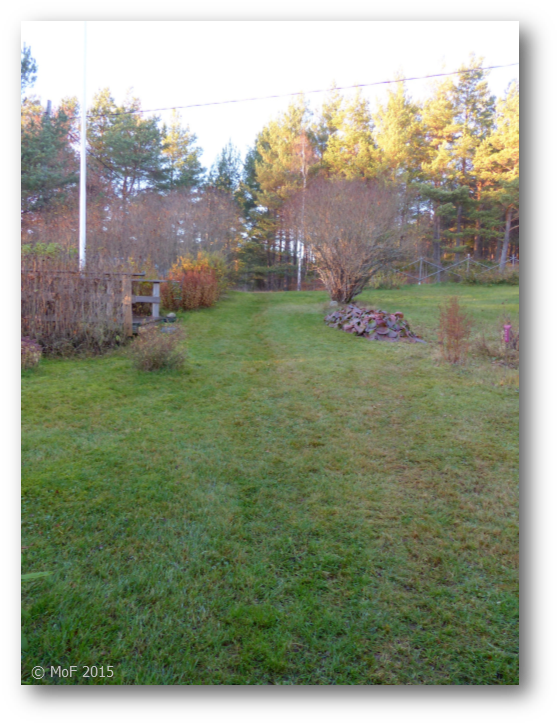Vid det här laget har de flesta träd och buskar på Udden fällt mestadelen av sina löv. Tack vare dom svaga eller obefintliga vindarna har dom inte yrt omkring så i år är det inga drivor. Men självfallet kändes det ändå påkallat att snygga till framför ”paradingången”. Nån annan har jag inte. 😀