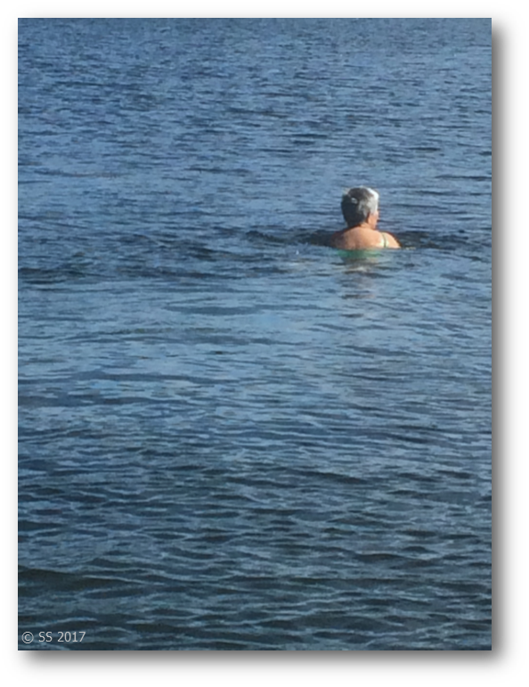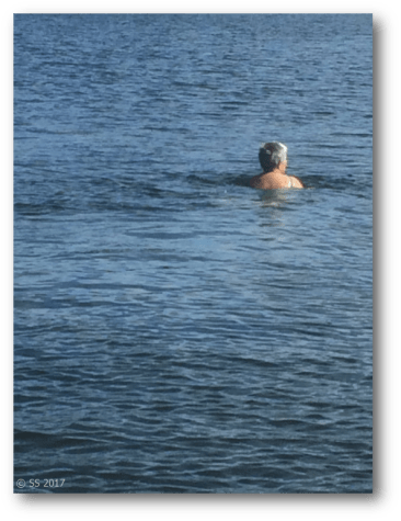 Och si, det gjorde jag. Vattentermometern visade redan 19°. ”Jamen det är ju vid ytan det” påpekade han. Han hade förstås helt rätt. Så snart jag kom lite längre ut stelnade blodet nästan i ådrorna, så jag simmade ögonaböj tillbaka till bryggan.