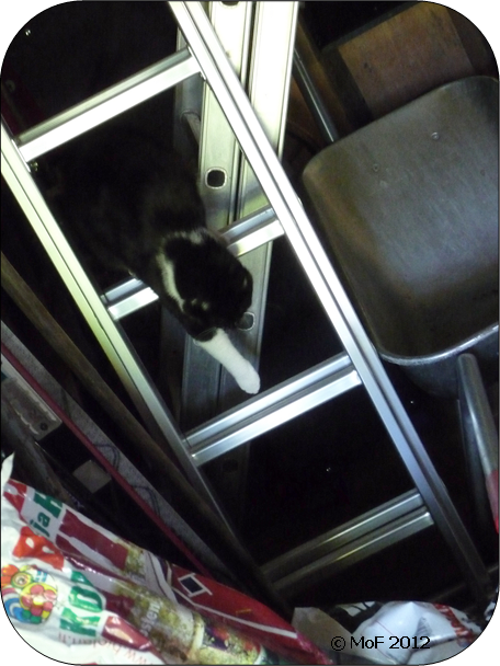 Idag hann jag fånga Mia på bild när hon klättrade ner från stegen efter besök på bodvinden. Bildkvali­teten blev inte den bästa eftersom hon rörde sig, men det framgår i alla fall att hon tar sig ner elegant. Duktig kisse. 🙂