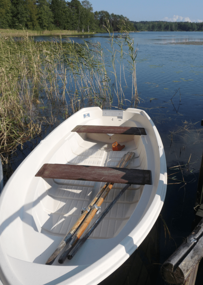 Vanligtvis brukar jag hålla efter och rengöra båten flera gånger per sommar, men i år har jag slarvat så det tog sin rundliga tid att bli av med alla be­lägg­ningar. När jag var liten har jag inget minne av att båten var grön och svart på insidan? Regnet och luften innehåller förstår mycket mera föroreningar nuförtiden. Men nu är den skinande ren. Duktig flicka. 🙂