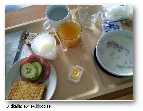 Vid tio-snåret ringde jag Husse och talade om att jag skulle få åka hem. Sjuksköterskan hade beställt sjuktaxi. I tron att den skulle dyka upp ganska snart tackade jag nej till lunch men var tvungen att ångra mig. Det var helt OK sa sköterskan, dom hade beställt mat till mig också.