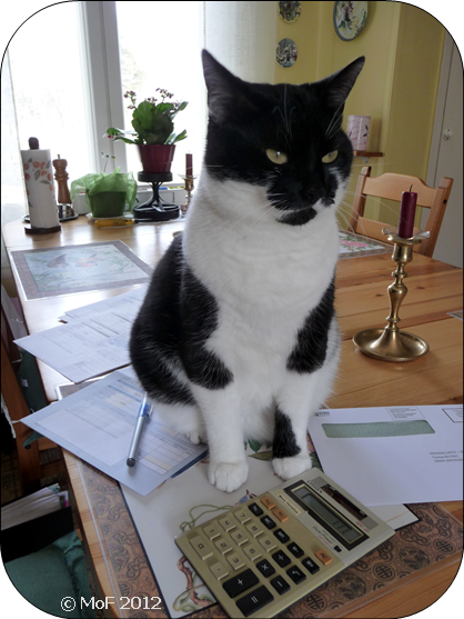 Mia tyckte det var lika tröttsamt som jag, vilket framgår av bilden. Hon ville som vanligt ligga på just dom papper jag behövde. På bilden ”blockerar” hon årets bokföring. 😀