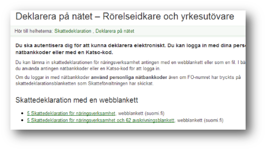 För en stund sen lämnade jag in företagsdeklarationen via suomi.fi. Har man ingen Katso-kod omdirigeras man dit när man ska deklarera elektroniskt. Det hade jag glömt men såg att jag gjorde likadant 2012. Bland mina e-tjänster hos suomi.fi ligger nu två års deklarationer, men bara i 24 månader blir man upplyst om.