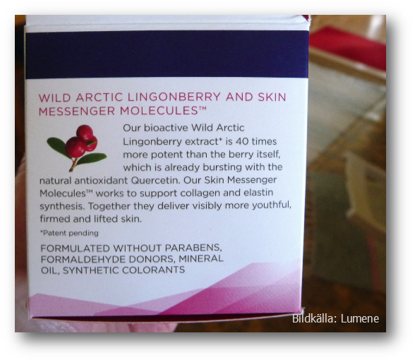 Den är för övrigt inte avsedd för min åldersgrupp framgår det av ”suggested age of use”. Stapeln på förpackningen sträcker sig från strax före 40 till ca 55 så i mitt fall har den tydligen ingen tidsfrysande effekt längre. 😀 Men den känns skön på huden, doftar milt och ser jättegod ut – som ljus vispgröt eller mosade lingon med vispgrädde.