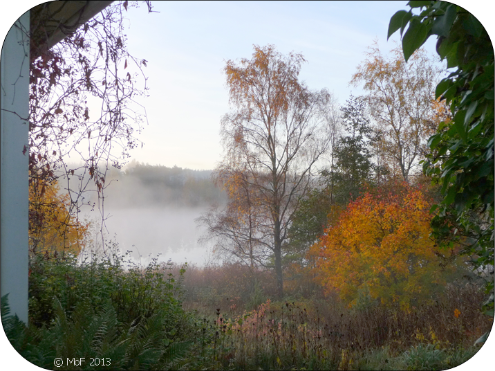 Kvart över sju i morse tyckte Mia det var dags att börja dagen. Det tyckte inte matte. Jag släppte yrvaket ut henne i dimman och la mig på nytt tills hon väckte mig för att få frukost vid halv nio.