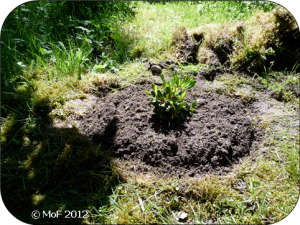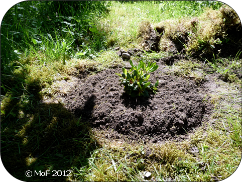 Översta jordlagret som jag ”skalade av” (uppe till höger i bild) blev utmärkt fyllning i en grop vid avloppstanken. Jag kan bara föreställa mig vad mossan och gräset hade att säga om den rockaden.