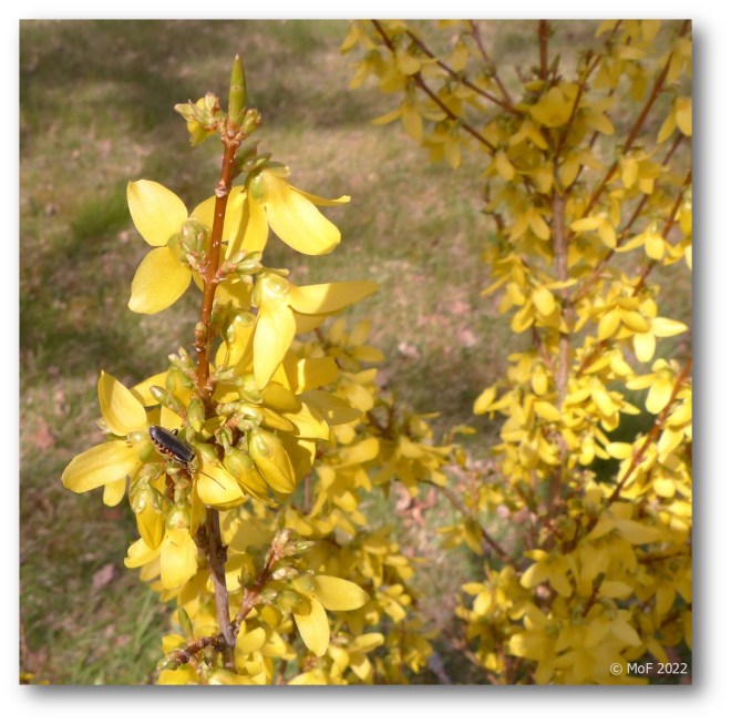 I lördags grävde jag en grop nästan mitt i gräsmattan, fyllde den delvis med kompostjord, gödslade lätt, vattnade och satte ner forsythian som jag köpte till rabatterat pris hos Multasormi tidigare i veckan. Jag ser den redan fullväxt i full blomprakt framför mig, men det lär ju ta några år.