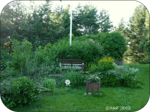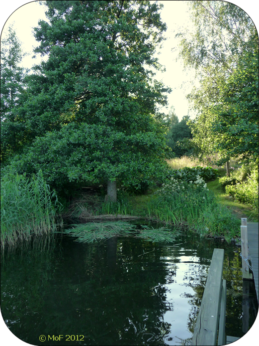 LönnenEftersom jag ändå hade ett användbart verktyg gav jag mig på kvistar och trädplantor intill och kom allt närmare tomtgränsen. Ett fullständigt me­nings­löst arbete sa jag högt till mig själv. Dom enda som rör sig där nere är djuren som ska ”besöka” Udden eller kommer för att dricka. Men snyggt blev det ju. 🙂