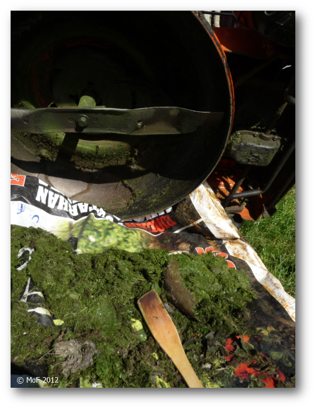 I samband med att jag fyllde på bränsle plockade jag fram en plastsäck som underlag för ren­gö­ringen. Gräsgeggan som bildas under klipparen är idealisk att lägga i dasskomposten, därför ville jag samla upp den.