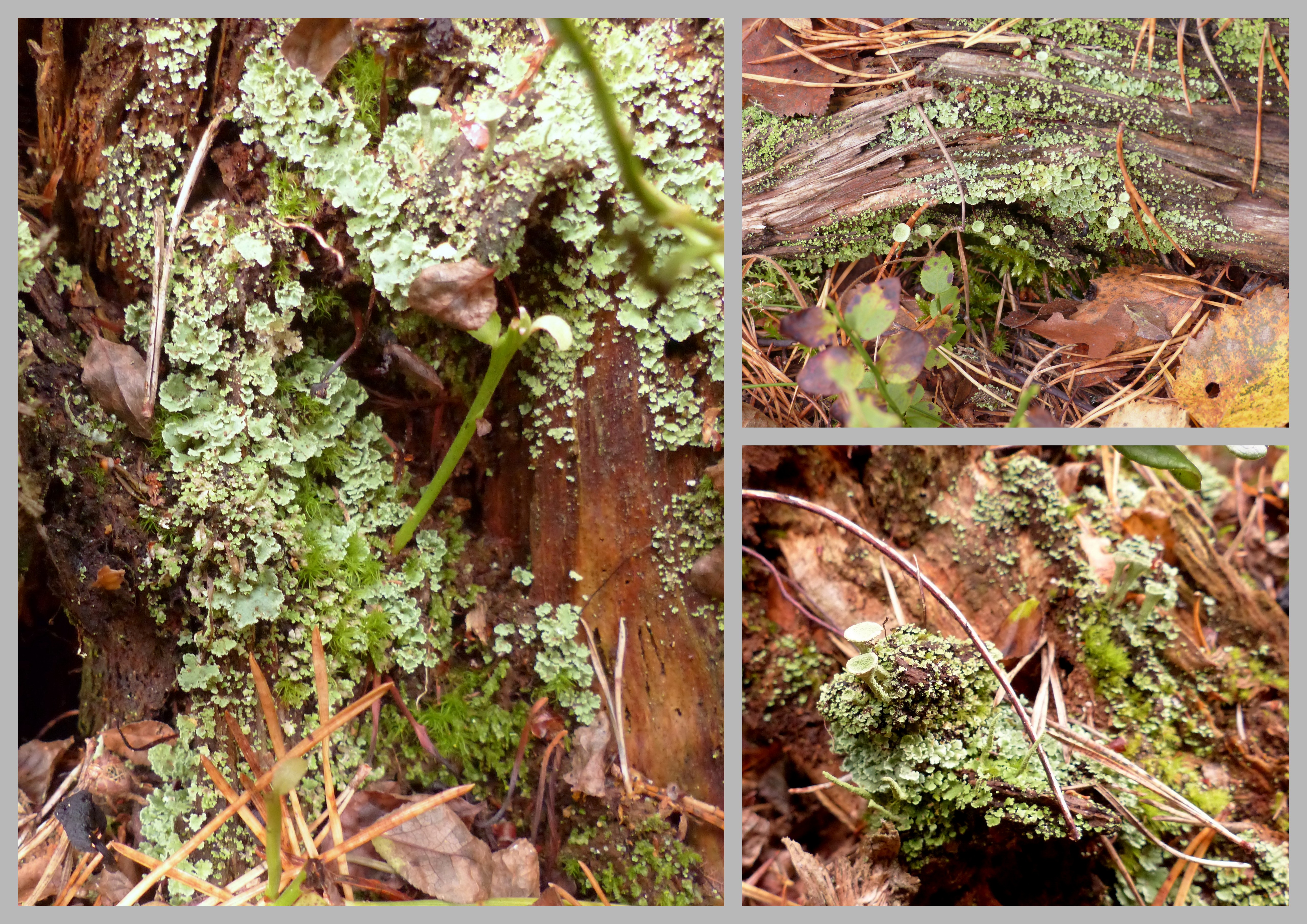 När vi vände tillbaka hemåt hade jag nästan fyllt botten på korgen med trattisar och passerade ett glest snår med getpors (skvattram). Innan vi nådde bebyggelsen fick jag syn på ett av mina absoluta favoritmotiv: en bit murket trä som pryddes av olika sorters lav. Oj, så fint! Naturen är den överlägset skickligaste konstnären!