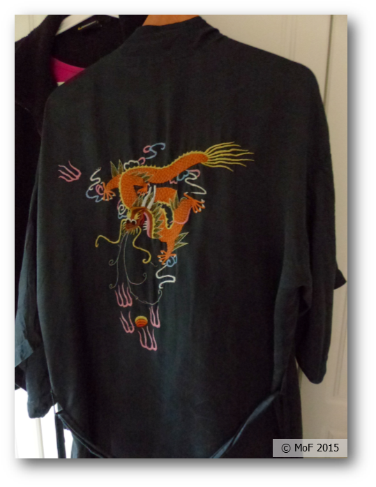 Souveniren består av en morgonrock i svart siden med en broderad drake på ryggen. Den var som gjord för mig, Drake som jag är, kände jag när jag fick syn på den i affären men nu börjar den som sagt bli lite luggsliten.