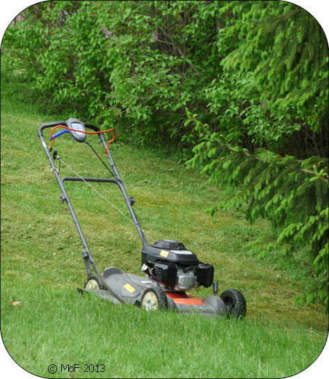 Efter att Husse åkt i väg till ett av sina andra hem, kom jag på att jag skulle klippa den sista gräs­plätten nere i stranden. Stora gräsklipparen skulle få tjänstgöra för första gången i år, men den var inte riktigt samarbetsvillig. Efter lite trixande gick den i gång till slut, så gräset blev klippt.