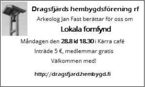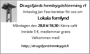 Igår kl 17 hade styrelsen i hembygdsföreningen möte i Dragegården. Det blev lika långt som jag misstänkte – tre timmar. Fast med tanke på att dagordningen innehöll 17 punkter var det fullt förståeligt. Nu gäller det bara att skriva protokollet innan jag hinner glömma detaljerna.
