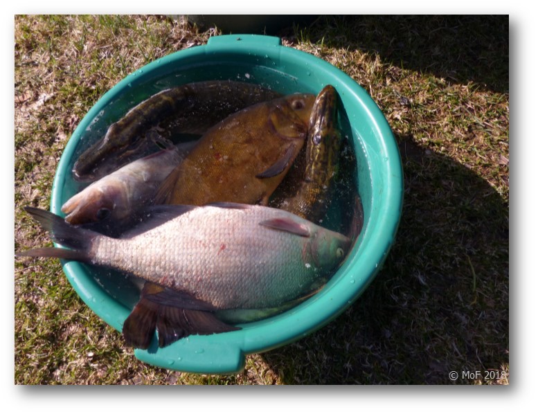 Fångsten bestod av två gäddor, två abborrar och två braxnar. Den ena gäddan var så liten att den får växa till sig beslöt vi och släppte den genast tillbaka i sjön. Braxnarna blev måsmat den här gången, men gäddan filéade Husse i vanlig ordning.
