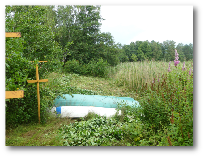 Det var drygt innan jag var nöjd, men inspirationen höll i sig så jag fortsatte med min lilla lie för att också få bort vassen invid bryggan. Husse hade gjort mig sällskap under tiden och höll på att kapa dom nya vasskotten i stranden.
